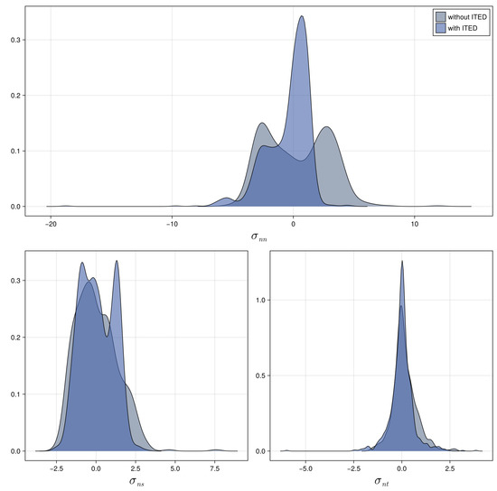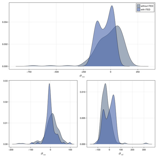 Figure 9 again shows the normal and shear stress density distributions on the interfaces of the two optimization results. Analogous to the cantilever, it can again be seen that the tensile stress on the interfaces decreases when the ITED is taken into account. On the one hand, the maximum normal stress decreases (maximum positive value) and the majority of the density distribution is shifted to the left. Consequently, in the case of the bracket, the developed method also fulfills requirement 1.