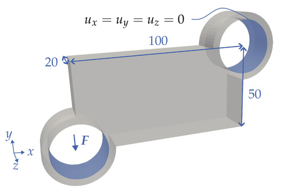 The second case is the bracket shown in Figure 7, which is often used in the topology optimization literature (see [39]). As a load, a force acting in the negative y-direction is applied via the inner surface of the lower left perforated cylinder. The inner surface of the upper right cylinder serves as the support. The following applies to the nodes of the inner surface: . The drilled-through cylinders on the inner surfaces of which the load is applied and the support is provided are considered as non-design space in the context of the optimization. The dimensions can be taken from Figure 7.
