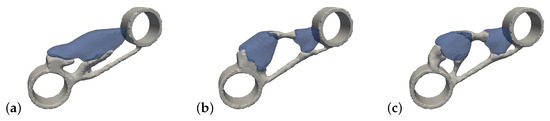 Optimization results of the bracket case for different values of the parameter (a) (iteration 245). (b) (iteration 217). (c) (iteration 198). Material 2 (blue) in the optimization with consists of one component, whereas it consists of two components in the other two optimizations.