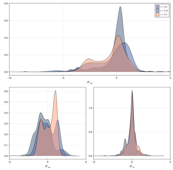 Density plots of the normal and shear stresses as well as of the interface for three different values of the parameter . The diagram illustrates that the maximum shear stresses decrease as the value of increases.
