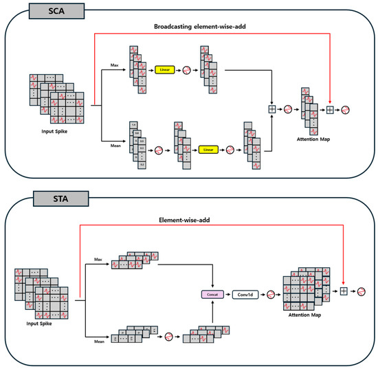 We introduce two convolution-based attention blocks, SCA and STA, specifically designed for spike-driven SNNs. These methods effectively adapt conventional ANN-based convolutional attention mechanisms for spike-based processing, enabling SNNs to achieve maximal performance improvements while fully maintaining spike-driven computations. The overall architecture of SCA and STA is shown in Figure 2.