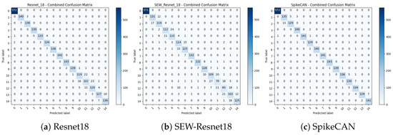 Compared to an SNN-based model, SEW-ResNet [26], SpikeCAN not only achieves higher accuracy but also requires fewer parameters and less energy. The confusion matrix presented in Figure 3 reveals that SpikeCAN maintains consistent classification accuracy across all classes, including Class 11 and Class 12, where other models tend to degrade sharply. These results demonstrate that SpikeCAN achieves an excellent balance between accuracy and efficiency. Its ability to deliver near-ANN-level performance while maintaining low computational and energy demands underscores its potential for practical deployment in real-world industrial monitoring systems.