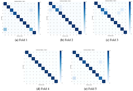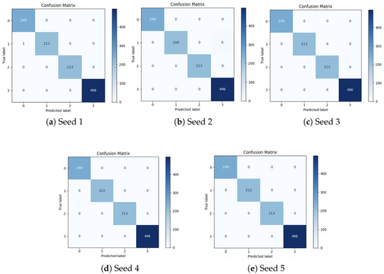 Furthermore, to provide comparisons with conventional algorithms, we conducted additional experiments using a 70:30 random split for training and testing datasets. To ensure robust evaluation, this random splitting procedure was repeated five times with distinct random seeds. As detailed in Table 3, SpikeCAN achieved an average classification accuracy of 99.88% under these conditions. Corresponding confusion matrices for each random seed are presented in Figure 4, clearly illustrating the consistency and reliability of SpikeCAN’s classification performance.