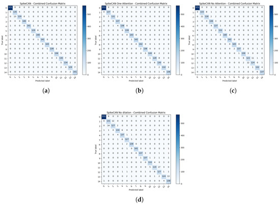 Confusion matrices illustrating the classification performance across different ablation scenarios compared with the original SpikeCAN model. (a) SpikeCAN. (b) SpikeCAN One Attention block. (c) SpikeCAN No Attention block. (d) SpikeCAN No dilation.