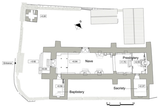 The foundation extends above ground level, reaching up to 2.0 m in certain elements of the main façade. The lateral walls and the main façade have a thickness of approximately 2.0 m, while the walls of the baptistery and sacristy range from 1.0 to 1.2 m in thickness. The main façade (Figure 2b) faces west, toward the plaza, and its gable end reaches a height of 11.5 m (measured from the reference level 0.0 m). This façade features the principal entrance, a door with stone jambs and a semicircular arch on the outer side of the wall, while the inner side has splayed jambs (embrasure) that support a timber lintel. A similar gate is situated in the middle of the north wall (Figure 2c).