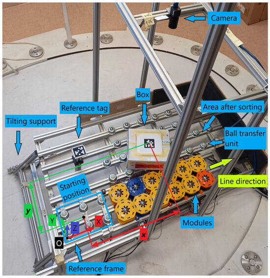 Similar to state-of-the-art solutions in the logistics industry [20], the proposed device includes a feedback system employing one or more cameras above the surface [15] (Figure 2), as seen in other in-plane handling technologies [1,17]. This sensor continuously processes frames of the working area to detect the position and other relevant information about the object handled in real time. Using this data, a processing unit (PC in Figure 1) connected to both the camera and the actuators (modules of the surface) is supposed to perform various handling tasks by applying appropriate control laws. With reference to the prototype surface shown in Figure 2, a FLIR Blackfly S Monochrome camera with 6.3 MP resolution and 59.6 fps is used as the sensor, while the processing unit includes a PC running Matlab (R2022b) for image analysis and an Arduino Mega for module actuation. In the illustrated setup, AprilTags [21] are applied to the object as fiducial markers for tracking and to the surface for reference. This approach allows the use of Matlab’s ReadAprilTag function to determine the tags’ poses and ID numbers. However, depending on the environment and task, other object detection strategies can also be applied.