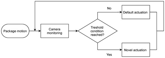 In scenarios where discrete, rule-based decisions are sufficient, the threshold-based control strategy offers an efficient way to trigger module actuation. It continuously monitors parcel features (such as identification markers) and activates the relevant module as soon as a preset condition is met (Figure 4), making it ideal for tasks like sorting and basic orientation. With reference to the experimental setup described in Section 2.1, a camera system captures images of the parcels as they travel along the surface. These images are processed in real time by a dedicated software environment, where a defined region of interest (ROI) is analyzed for markers, such as AprilTags, that identify each package. When a marker is detected and its identification code is retrieved, the control system compares the information against preset thresholds corresponding to the desired operation.