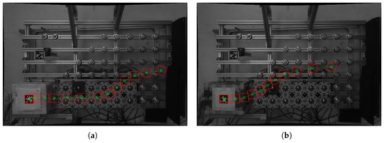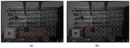 Returning to the actual sorting for the different cases and package types, Figure 7 displays the trajectories for case CS1, and Figure 8 displays the trajectories for case CS2. More precisely, the AprilTag’s contour is indicated in red, and the locations and paths of the tag’s center are indicated by circular markers and continuous green lines, respectively. Beginning with the first case CS1, it can be seen that Box A proceeds straight in Figure 7a, while Box B performs the sorting immediately in Figure 7b. On the other hand, for the second case, CS2, Figure 8a shows the sorting at the end of the line for Box A, while it happens at the beginning of the line for Box B, as in Figure 8b. The efficacy of this control for the examined tasks is demonstrated by these two images, which highlight agreement between the intended sorting results (Figure 6) and the actual ones.