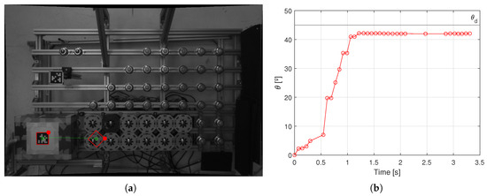 Figure 9a and Figure 10a illustrate the poses of the tags and the trajectories taken with the same markers and colors as the previous operations outcomes. For this case, an extra red circular marker was added to one corner of the tag to graphically clarify the magnitude and direction of the rotation. For the quantitative depiction, Figure 9b and Figure 10b describe the desired angle and the trend of the angle over time, respectively, for Box A and Box B. As seen from both pairs of images, the re-orientations are accomplished with minimal margins of error, i.e., ° instead of ° and ° instead of ° (both relative percentage errors: %). The values in the examples appear reasonable when taking into account the uses for these surface capabilities. The orientation along the line might, in fact, optimize palletizing or later re-handling operations that do not require extremely precise positioning while shipping packages or transporting materials.