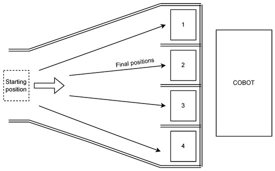 An “end of the line” sorting scenario with four outputs was selected for the initial simulation of a possible use. This task emerged after a discussion with the industrial partner Dumarey Flowmotion Technology, during a research stay at the company. Practically, they had a line with four final codes that needed to be separated into different slots to speed up and simplify palletization with a cobot (Figure 11).