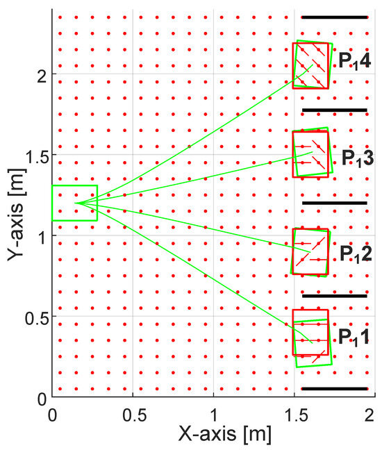 The selection of activated modules depends on both the final objective and the nature of the threshold condition met. Different types of thresholds can be defined. For instance, in one category of tests, the control system directs parcels along different trajectories using predefined module orientations based solely on their identifying IDs. In these tests, the threshold condition is simply the package’s “name.” In another set of experiments, the system is used for package reorientation. Here, the primary goal is to adjust the orientation of a parcel by specific angles as it passes through the smart surface. Consequently, in this case, the threshold variable is the angle, requiring more extensive and continuous monitoring.