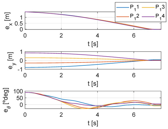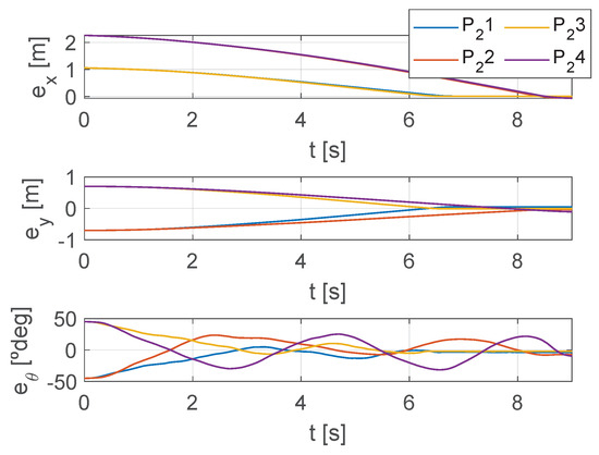 Quantitative reference values are provided for this application as well by reporting the numerical values of the errors at each instant and the settling times. Figure 16 contains the errors data, where trends and oscillations similar to PATH 1 can be observed. Furthermore, for , and of Figure 16, the package halting in the desired position is visible. In fact, appreciably earlier than 9 s, as also highlighted by the settling times of Table 4, the errors remain constant as the package maintains its target position. This demonstrates that the surface’s effect is continuous throughout the work rather than immediate, with errors not just approaching zero at the chosen simulation time.