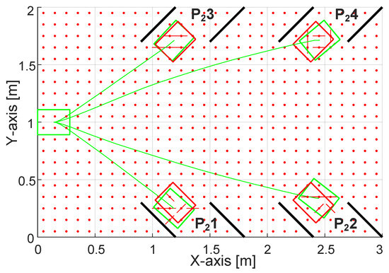 As before, initial and final positions, package characteristics, the surface inputs, and the layout were all predetermined. Instead, the actuation of the modules underneath the transported body at each instant was determined in real time. The Matlab visualization in Figure 15 displays the solutions for carrying out these processes. Both the symbols and the input values, such as the initial speed (0.05 m/s), the surface inclination (8°), and other parameters, are identical to those in the previous subsection. In this case, the only differences are in the target positions (named , , , and ), which are at the sides of the line at angles of °, and the layout (footprint 3 m × 2 m). The simulation time was also extended to nine seconds in light of the longer surface that was selected. Although they differ significantly from the PATH 1 case and from one another, the intended configurations are achieved, as seen in Figure 15. This means that the selected controller coefficients , , and are still in use.