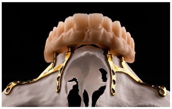 Figure 2. Maxillary CSI with transepithelial abutments. Laser sintering titanium Grade 23 (Ti6AI4V ELI alloy) with thickness of 0.8 mm using an EOS M290 printer. (Avinent, Santpedor, Spain). - The materials used to fabricate definite prostheses over conventional endosseous dental implants can also be used in CSI prostheses [,,]. New CAD-CAM materials (titanium or PEEK) with PMMA or composite resin coatings can be considered in order to reduce the weight of the prosthesis and/or to minimize overload on the CSI (EO) (Figure 3).