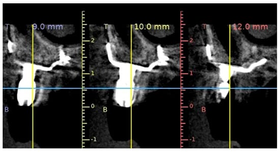 Figure 5. A sagittal cone-beam computed tomography slice showing the radiological setting of the CSI (Avinent, Santpedor, Spain). - The number of fixation screws should ensure adequate mechanical stability of the CSI. A minimum of two screws per fixation area (palatal, zygomatic or nasal) is recommended []. Since the stability of the CSI depends on the number and length of the screws, their placement in the fixation areas should be maximized. Fixation screws in areas close to the alveolar ridge may increase the risk of CSI exposure, since they affect the design of the implant [] (Figure 6).