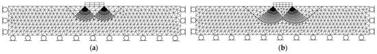 To better understand the sliding failure behavior within the fan-shaped zone and to evaluate the accuracy of different minimum upper-bound estimates, this study subdivided the sector into multiple slices and employed a multi-segment, zero-thickness interface element for simulation. Convergence analysis showed that the error between the numerical results and the upper-bound solution from the limit analysis was minimized when the sector was divided into 30 slices, corresponding to an internal angle of 3° for each slice within the 90° fan-shaped zone. To streamline the mesh generation process while maintaining sufficient accuracy, this study adopts a simplified configuration of 18 slices, where each internal angle is 5°. The analysis employs a multi-segment, zero-thickness interface element formulation, and the corresponding finite element mesh diagram is illustrated in Figure 6b.