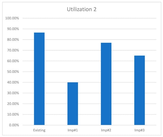 Chart 2, titled “Utilization 2,” presents the utilization rates across four scenarios: existing, Improvement 1, Improvement 2, and Improvement 3. The existing system showed the highest utilization at 87%. In contrast, Improvement 1 significantly reduced utilization to 40%, indicating potential underutilization. Improvement 2 maintained a high utilization rate of 78%, comparable to the existing scenario. Improvement 3 achieved a moderate utilization of 67%. While Improvement 1 effectively reduced queue length, it did so at the cost of low resource utilization. In comparison, Improvement 2 offered a more balanced outcome, combining queue reduction with sustained high utilization.