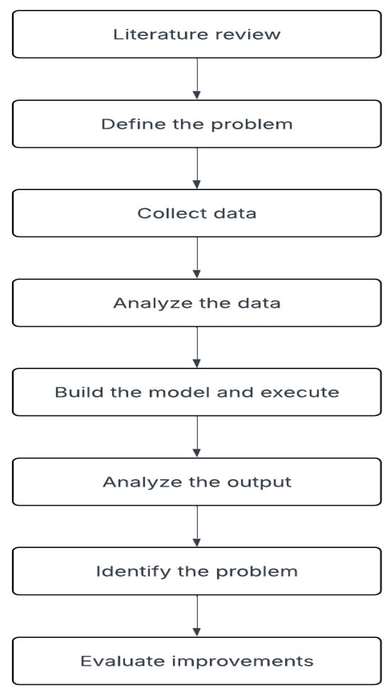 The research methodology employed in the Arena simulation project is depicted in Figure 2. Before describing the issue and gathering pertinent information like processing times and arrival rates, a literature review is conducted to comprehend previous research. A simulation model is created and run in Arena following data analysis. After that, output results are examined to find bottlenecks and assess enhancements. Because of this iterative process, the model may be continuously improved depending on performance metrics such as queue lengths, machine utilization, cycle time, and work-in-progress. A realistic, data-driven simulation for CNC production process optimization is guaranteed with this methodical approach.