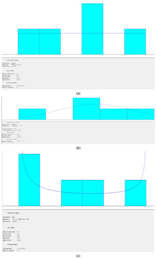 (a) Uniform distribution using the Arena Input Analyzer; (b) normal distribution using the Arena Input Analyzer; (c) beta distribution using the Arena Input Analyzer.