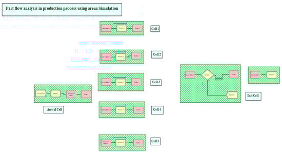 Figure 4 illustrates the Arena simulation model (part entity) used to represent the CNC production system. In the model, the parts arrived at fixed intervals of 30 min, reflecting a constant inter-arrival time. The production line consisted of five main processes: CNC turning, CNC milling, drilling, inspection, and rework loops for defective items. A transfer time of 2 min was incorporated between each station to simulate material handling and movement.