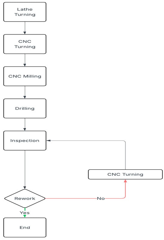 With precise and sequential operations like turning, milling, drilling, and inspection, CNC machining cells are frequently at the center of the production flow in modern manufacturing. Flow modeling becomes more complex when parts undergo various operations because of their dynamic behavior, particularly when rework is included. Accurate simulation of such systems can reveal information about performance measures like throughput, queue length, cycle time, and bottlenecks, according to research by [,]. For simulation models to accurately depict system behavior, rework—a major hindrance to smooth component flow—must be included. Rework loops, according to [], result in longer cycle times, congestion at crucial equipment, and decreased overall efficiency, particularly when machines such as CNC turning are overworked because of the repeated re-entry of defective parts.