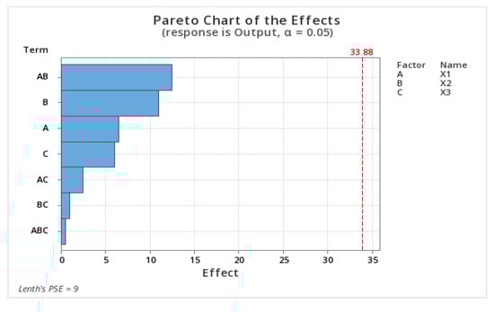 The Pareto chart in Figure 8 shows that none of the factors or interactions were statistically significant at the 0.05 level, as no effect exceeded the reference line of 33.88. However, the interaction between factors A and B (AB) and the main effects of B and A showed relatively larger influences on the output, with AB being the highest. Factor C and its interactions (AC, BC, and ABC) had minimal effects. For practical improvement, focus should be placed on factors A, B, and C, and their interaction.