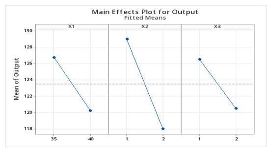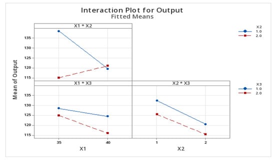 Figure 9 shows the plot of the output’s main effects, illustrating the variation in the mean output with varying quantities of variables X1, X2, and X3. As each element increased from its lowest to its highest level, the graph shows that output fell. After X1 and X3, factor X2 had the sharpest slope, indicating that it had the greatest effect on production. For example, when X1 was at 35, X2 was at level 1, and X3 was at level 1, the greatest mean output was recorded. Setting the process at the lowest levels of all three factors, we found that X2 will particularly optimize production.