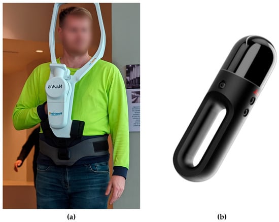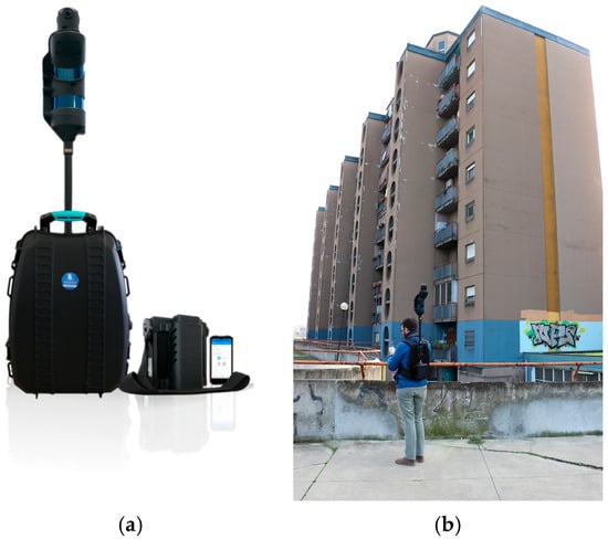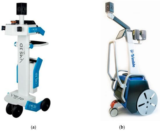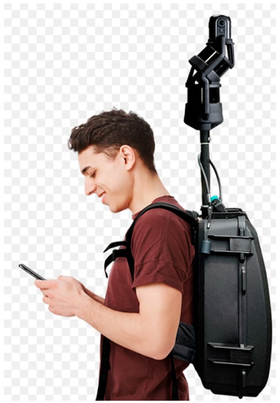 Without going into the specifics of obsolete platforms, modern developments have transformed these systems into solutions that are more manageable for operators. Examples of such instruments include the Gexcel Heron® Twin Color (Brescia, Italy) (Figure 2) [75,76], Viametris® MS-96 [77], and NAVVIS® [78,79] (Figure 3a) and Leica® BLK2Go® (Heerbrugg, Switzerland) [80,81] (Figure 3b), which, despite employing different solutions, stand out by increased portability, with wearable solutions that can be carried on the operator’s shoulders, facilitating access to multi-level buildings or construction sites.