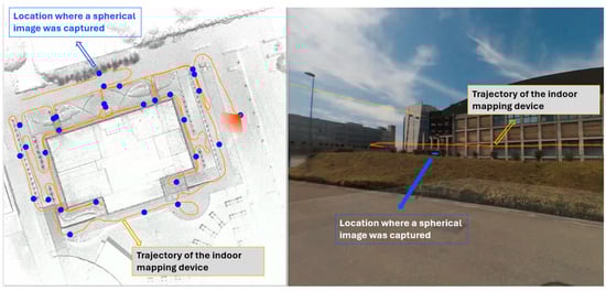 Example of a virtual tour of a survey carried out by iMMS (University of Brescia Campus). The image shows what is visualized by the software and represents a virtual tour through the mapped site. On the left-hand side, the point cloud projection onto the horizontal plane is displayed. The yellow line indicates the trajectory followed by the surveyor, and the blue dots represent the positions where the on-demand spherical images were taken.