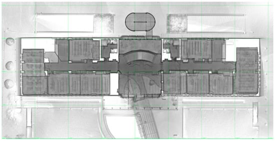 A blueprint of the University of Brescia building, created using a mobile mapping device. The image represents a projection of the 3D point cloud acquired by the indoor mobile mapping system onto a plane. This method of visualizing the point cloud is very user-friendly for technicians who are not experts in working with three-dimensional software tools.
