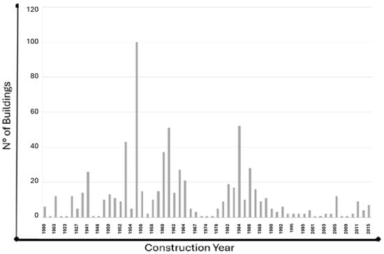 The methodology employed in Milan, northern Italy, is noteworthy in relation to the state-of-the-art technologies applied. The case study facilitated the examination, analysis, and definition of functional procedures for a systematic asset survey using the iMMS approach on a large real estate property, specifically that of the Municipality of Milan in northern Italy. The project pertains to the Municipality of Milan, which, in 2015, delegated the management of its public housing assets to the company MM spa [88]. The housing inventory of the City of Milan consists of approximately 1100 structures, organized into over 300 complexes. These buildings house nearly 30,000 units, around 1300 of which are for non-residential purposes, referred to as “miscellaneous uses”, including stores, workshops, and offices. Additionally, there are about 9500 units, including garages and parking spaces, bringing the total to nearly 40,000 units under management. This statistic includes around 1500 housing units located in adjacent municipalities or beyond the City of Milan. The public housing inventory maintained by the Municipality of Milan shows clear historical stratification (Figure 6), primarily linked to the cyclical pattern of housing initiatives aimed at supporting economically disadvantaged segments of the population during the previous century.