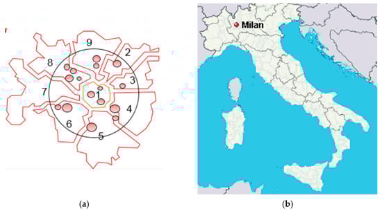 (a) The buildings of the project, managed by MM inside Milan, are organized in nine main areas. (b) Milan is the main industrial city of Italy, located in the northern part of the country (courtesy of MM).