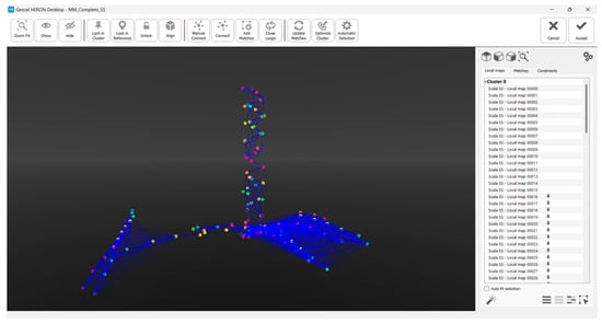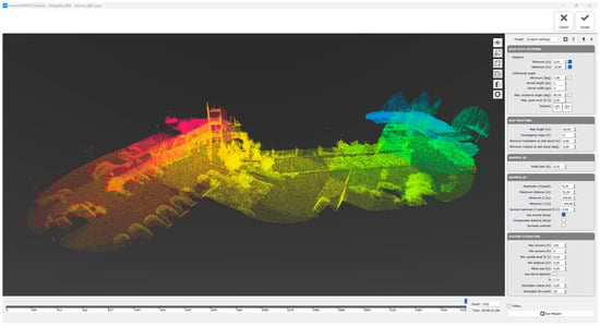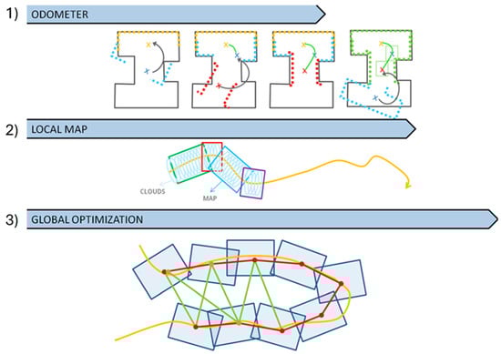 The data processing approach of static laser scanners differs substantially from the process of producing the point cloud from iMMS instruments. The point cloud generated in a post-processing phase by the SLAM algorithm does not perfectly match the data acquired by the LiDAR sensor. First of all, the operator’s trajectory is estimated by the SLAM algorithm by combining the raw data acquired by the LiDAR sensor and the IMU. Such an operation is performed in post-processing, and various system manufacturers and research teams have developed proprietary solutions to improve and optimize the estimation of the instrument’s trajectory [56]. For example, the research group at the JRC of the European Commission has developed the local maps approach [57], which consists of “a robust Global Matching technique focused on 3D mapping applications using laser range finders”. The method operates on the presumption that the projection of the observed coordinates along the gravity direction during the mapping process can identify locations. By aligning their 2D projective representations and utilizing the corresponding dimensional reduction, the relative poses between pairs of 3D point clouds are calculated in order to improve the trajectory evaluation performed by the SLAM algorithm. After the trajectory is estimated, the software generates the point cloud at the required resolution, taking into account any geometric constraints, which typically consist of control points. It is obvious that the quality of the point cloud model generated is directly correlated with the accuracy of the trajectory estimation provided by the instrument.