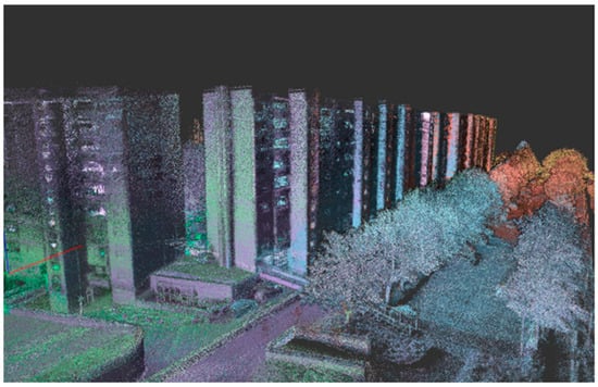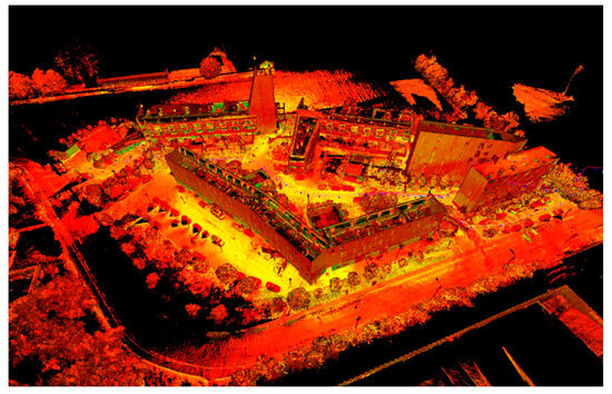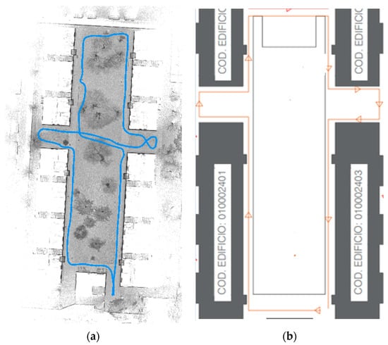 Nonetheless, these technologies have the significant advantage of facilitating the rapid survey of large sites, producing survey accuracies frequently aligned with the requirements of a real estate rehabilitation project, typically within 1–2 cm locally and several centimeters in the global model. SLAM technology greatly simplifies field measuring processes while simultaneously reducing their costs. Since centimeter-level accuracy is not required for the global model in geospatial projects, the setup of control points or control scans can be abandoned in such applications [52,53]. An important advantage of SLAM-based iMMS techniques is the ability to operate in hybrid environments, which include both outdoor and indoor conditions, with the primary constraint being the need for adequate three-dimensional geometry in the surveyed areas [54,55]. This limitation precludes open areas lacking geometrical features, such as broad spaces characterized by highly regular geometries, such as regular concrete road tunnels. Moreover, SLAM requires that the surveyed geometry remain stable, and consequently, measurements in densely vegetated areas with strong winds that cause significant leaf movement should be avoided.