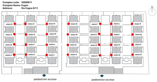 As can be seen, the complex sheet contains numerous useful pieces of information for the survey activity, such as the presence or absence of a caretaker, the number of buildings, landings, cellars, and technical rooms, as well as the extent of the outdoor areas surrounding the building. These sheets allowed, during the planning phase of the survey activities, to estimate with good accuracy the extent of the sites to be surveyed. In particular, Table 1, which describes the number of environments that the project had to survey, shows the significance and scale of the surveying project.