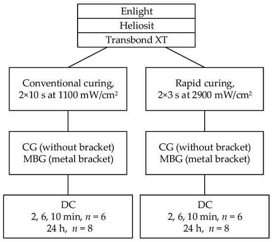 - Mavropoulos, A.; Cattani-Lorente, M.; Krejci, I.; Staudt, C.B. Kinetics of Light-Cure Bracket Bonding: Power Density vs Exposure Duration. Am. J. Orthod. Dentofacial Orthop. 2008, 134, 543–547. [Google Scholar] [CrossRef]