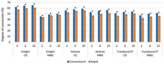 DC values for Enlight, Heliosit, and Transbond XT at 2, 6, and 10 min. Statistically significant differences (p < 0.05) between curing protocols are indicated with asterisks (*).
