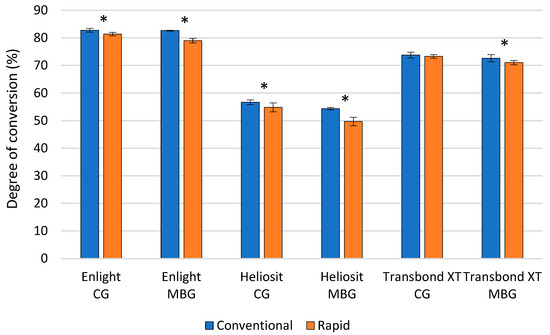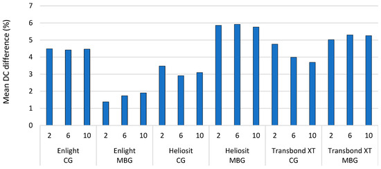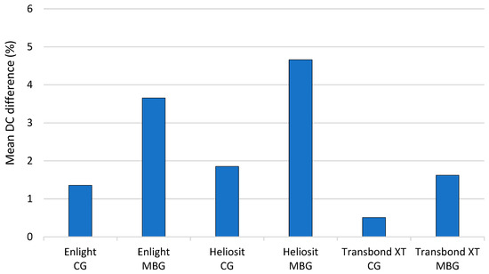 The 24 h DC values were consistently higher than the short-term values for all materials and protocols (Figure 4). For the conventional curing protocol, the 24 h DC values ranged from 56.7 to 82.8 in the CG and from 54.4 to 82.7 in the MBG, with Enlight showing the highest values in both groups. Rapid curing resulted in lower 24 h DC values across all materials (p = 0.001–0.012), except for Transbond XT in the CG, where no significant difference was observed (p = 0.244). For the rapid curing protocol, the 24 h DC values ranged from 54.8 to 81.4 in the CG and from 49.7 to 79.0 in the MBG. The differences between rapid and conventional curing in the 24 h DC values were smaller than those observed in the short-term DC values, varying from 0.5% to 1.9% in the CG and from 1.7% to 4.7% in the MBG, with the greatest difference seen in Heliosit (Figure 5).