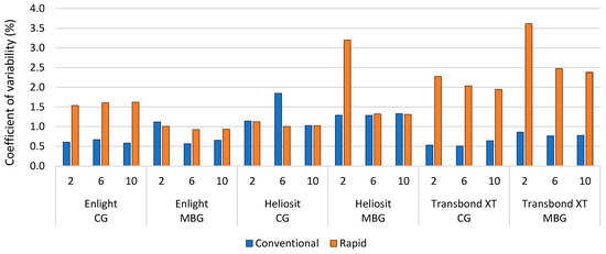 Rapid curing mode was associated with increased inter-sample variability for short-term measurements (Figure 6), ranging from 0.9% to 3.6%, in comparison to conventional curing, which demonstrated variability between 0.8% and 1.5%. Heliosit and Transbond XT in the MBG showed the highest levels of variability, particularly at the 2 min time point (3.1% and 3.6%, respectively).