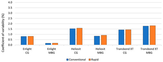 Coefficients of variability were similar in the 24 h DC measurements, ranging from 0.8% to 1.7% for the conventional protocol and 0.8% to 1.8% for the rapid curing protocol (Figure 7).