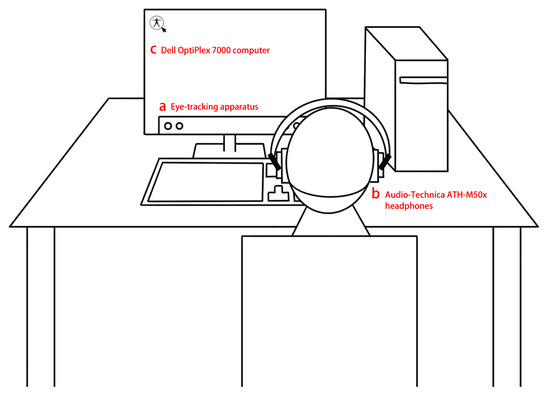 This study employed eye-tracking methodology with a two-component hardware system: (1) a primary workstation comprising a Dell OptiPlex 7000 computer (Dell Inc., Xiamen, China) paired with a Dell E2423H monitor (1920 × 1080 pixel resolution) and eye-tracking apparatus (Devices a and c in Figure 1), and (2) Audio-Technica ATH-M50x headphones (Audio-Technica Corporation, Tokyo, Japan) for auditory stimulus delivery in Groups C and D (Devices b in Figure 1). Participants maintained a fixed viewing distance of 60–70 cm from the eye tracker to ensure data consistency.