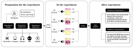 Group A/C received identical visual stimuli, as did Group B/D. The critical distinction was that Group C and Group D additionally received synchronized auditory stimuli during word presentation. All groups completed the experimental procedure sequentially, with the results analyzed by group. Figure 2 illustrates the experimental workflow.