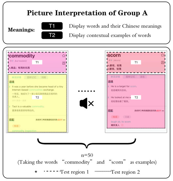 Group A comprised 20 participants (9 males, 11 females) exposed to no sound and image stimuli. The pictorial stimuli were systematically divided into two distinct regions: T1 (Display words and their Chinese meanings) and T2 (Display contextual examples of words). No auditory stimuli were presented in this condition. Figure 3 illustrates the specific visual presentation format.
