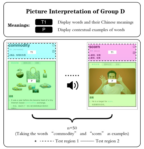 Group D consisted of 20 participants (11 males, 9 females). The visual stimuli were partitioned into two distinct regions: T1 (Display words and their Chinese meanings) and P (Display pictures related to words). Similar to Group C, this condition incorporated synchronized auditory stimuli consisting of word pronunciations. The complete stimulus configuration is illustrated in Figure 6.