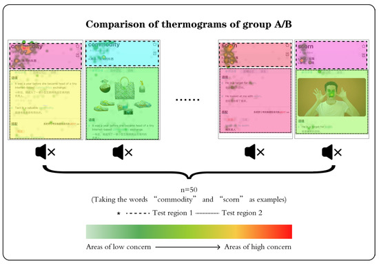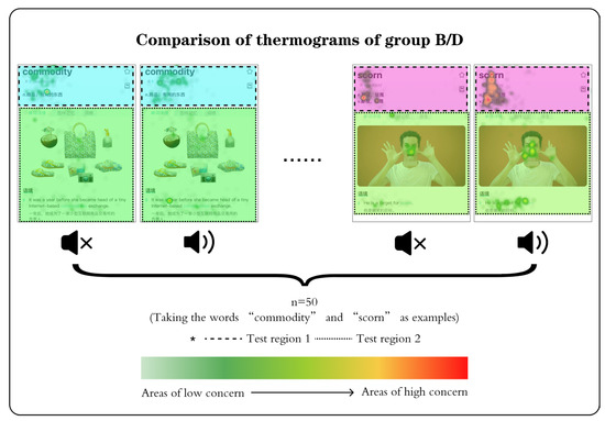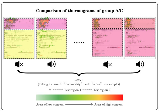 For Objective 1 (examining auditory stimulus effects on lexical memory), rigorous variable control was implemented during comparative analyses. The presence/absence of auditory stimuli served as the independent variable for evaluating differences in lexical memory and saccadic frequency. Figure 7 and Figure 8 present comparative thermogram visualizations for Group A/C and Group B/D, respectively.