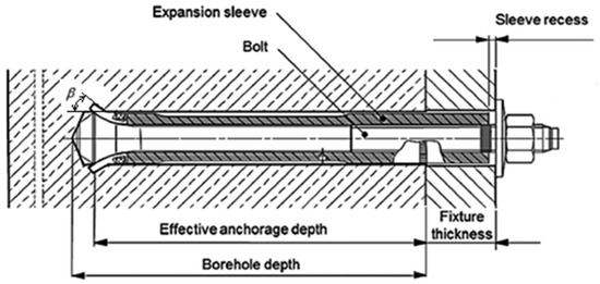 Figure 1 presents a typical configuration of an undercut anchor system, specifically a commercially available design produced by HILTI. A key area of research interest concerning such anchors is the determination of the maximum safe load that can be applied without causing either pull-out failure or fracture of the anchor shaft. An analysis of catalog data [39,40] showed that the angle of undercut β resulting from the design parameters of HILTI-HDA type anchors is about 15°. Its value depends largely on the precision of the installation [41] and the precision of the hole for the anchor.