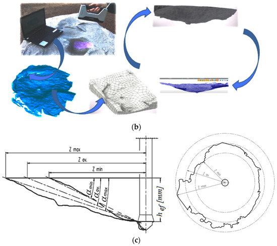 (a) Components of the experimental setup, measurement signal recording equipment, and recorded parameters: 1—cylinder support; 2—hydraulic cylinder; 3—hand pump set with a pressure gauge; 4—digital recorder; 5—current force acting on the anchor. (b) Identification of the geometric parameters of the failure surface using a Shining 3D handheld 3D laser scanner. (c) Characteristic parameters of the failure surface: hef—effective anchorage depth; α—breakout cone angle; Z—extent of detachment measured on the free surface of the rock medium.