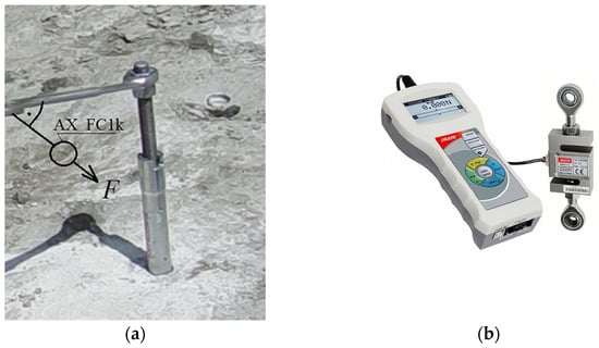 The application of the installation torque (a) to the anchor’s threaded bolt (as in position 3, Figure 1) that led to the breakout prism detachment; F—force required to turn the threaded bolt in the anchor; (b) electronic force gauge with an external sensor (AX_FC1k).