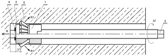 Modified anchor design for rock mass detachment: 1—undercutting element of the anchor head; 2—conical expansion element; 3—drive screw (anchor core); 4—setting ring; 5—induced crack/fracture in the rock mass; R—reaction force of the drive screw acting on the borehole bottom; R1—reaction force of the anchor head acting on the rock in the undercut zone; M—applied torque on the drive screw; ΔY—incremental (axial) displacement.