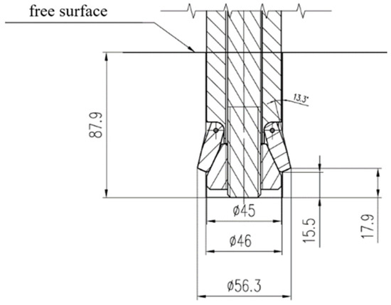 The nominal dimensions of the borehole in the rock (Figure 7), in which the anchor is expanded to its working position, are determined by the characteristic dimensions of the anchor head in its fully expanded state, corresponding to the mounting configuration shown in Figure 4. The borehole (Figure 7) is prepared in advance using a dedicated drill bit and an undercutting tool designed to produce the required borehole profile [62].